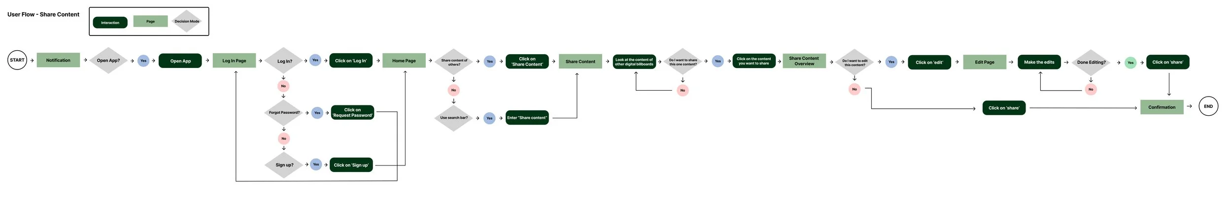 Based on the task flow, the user flow was created to show how a digital billboard users can share content from other users from start to finish (zoom in on the picture to read it properly).