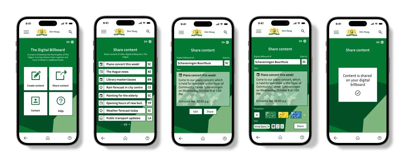 To visualise what the digital billboard app will look like, I first created the structure wireframes in Figma. In doing so, I looked at several apps and website designs of The Municipality of The Hague and applied in into the wireframes.